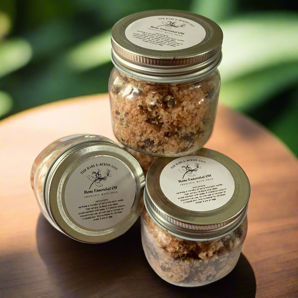 foaming bath salts with rose absolute essential oil and dried rose petals